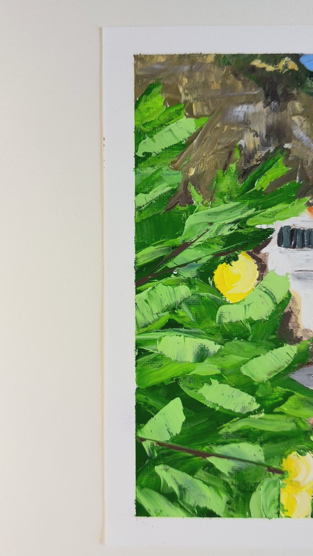 Vibrant oil painting of the Italian Amalfi Coast, using a palette knife.